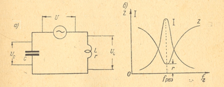 Схема (а) и резонансные кривые (б) для резонанса напряжений