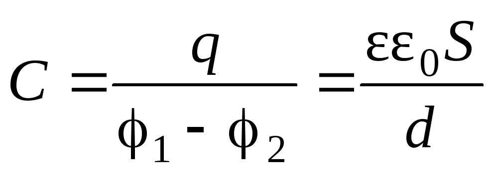 С =εε 0 S/ d, где ε – диэлектрическая проницаемость материала, находящегося между обкладками конденсатора; ε 0 – диэлектрическая проницаемость вакуума; S – величина площади поверхности пластины (меньшей, если они не равны); d – расстояние между пластинами.