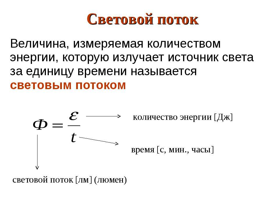 Величина светового потока (Ф) определяется как мощность излучения того или иного источника света, вызывающая определённое световое ощущение в зрительном органе человека и измеряемая в люменах (Лм.). Обычная лампа накаливания мощностью 100 ватт, например, создает световой поток в 1200 Лм. А 26-ваттная газоразрядная лампа характеризуется световым потоком в 1600 люменов.