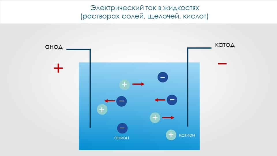 Оговоримся сразу – не все жидкости являются проводниками. Электрический ток возможен в кислотных, щёлочных и соляных растворах. Иначе говоря – в средах, где имеются заряженные ионы.