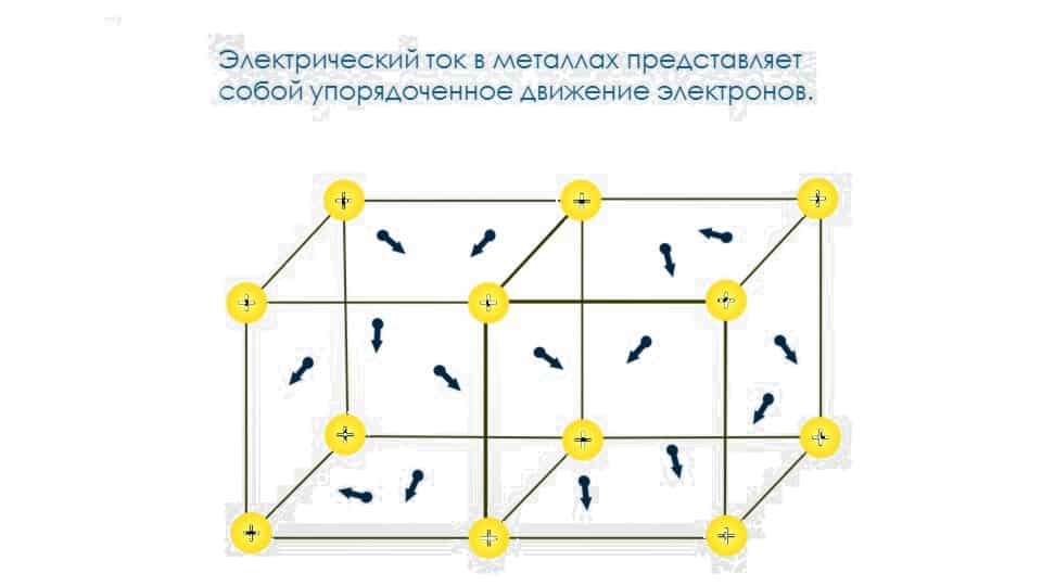 Носителями тока в металлических проводниках являются свободные электроны, которые из-за слабых электрических связей хаотично блуждают внутри кристаллических решёток (рис. 3). Как только в проводнике появляется ЭДС, электроны начинают упорядочено дрейфовать в сторону позитивного полюса источника питания.