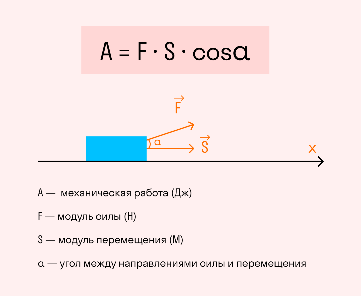 Если направления модуля приложения силы и модуля перемещения объекта совпадают, угол будет равен 0 градусов, а его косинус равен 1. В таком случае формулу можно упростить: