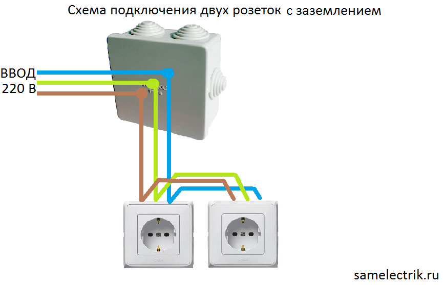 Схема подключения сдвоенных розеток с заземлением выглядит так:
