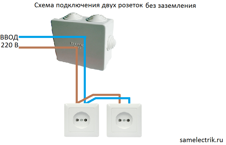 Если в Вашем доме двухпроводная сеть (без земли), то в этом случае подсоединение сдвоенных розеток должно осуществляться по схеме без заземления: