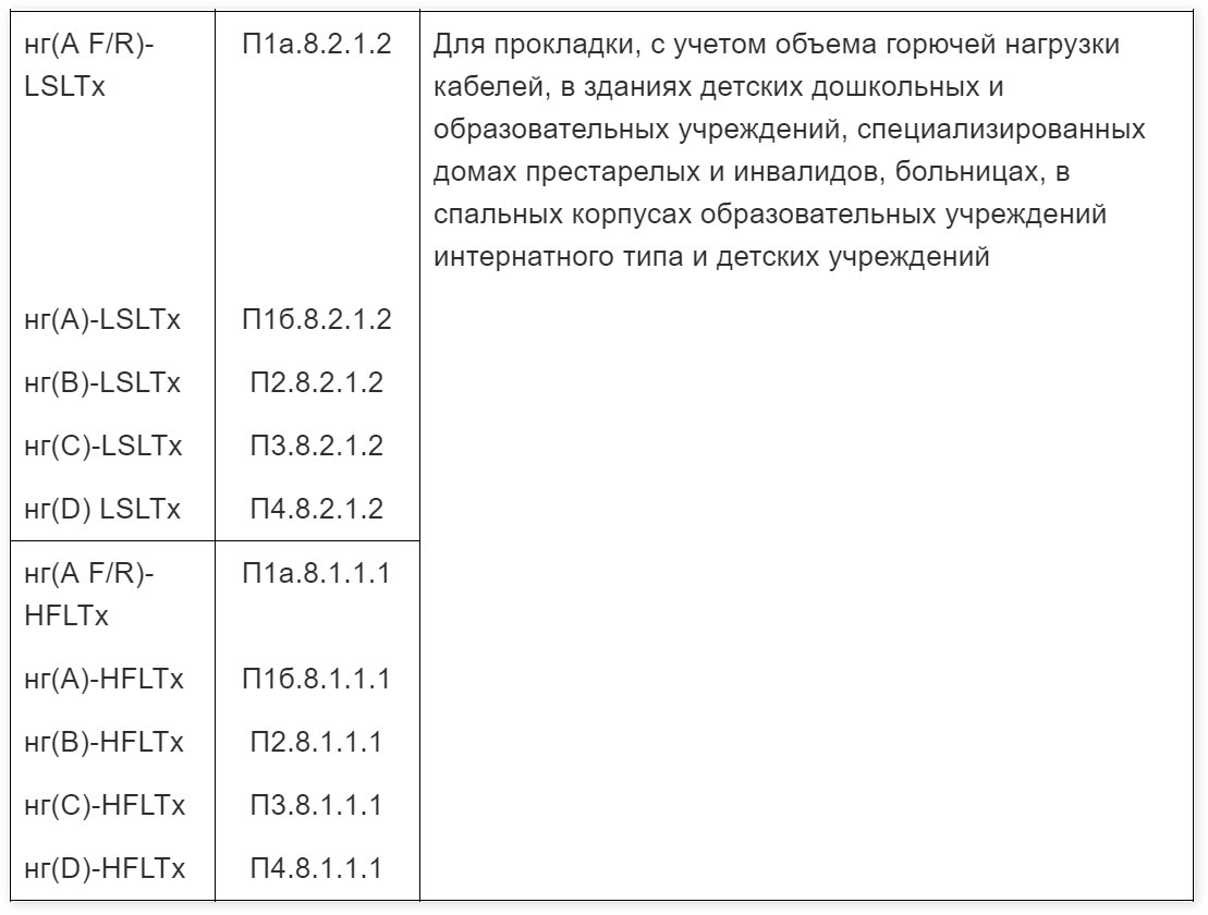 нг(А)-HFLTx — не распространяют горение при групповой прокладке, с низкой коррозионной активностью продуктов горения (Halogen Free), низкой токсичностью продуктов горения (Low Toxicity)