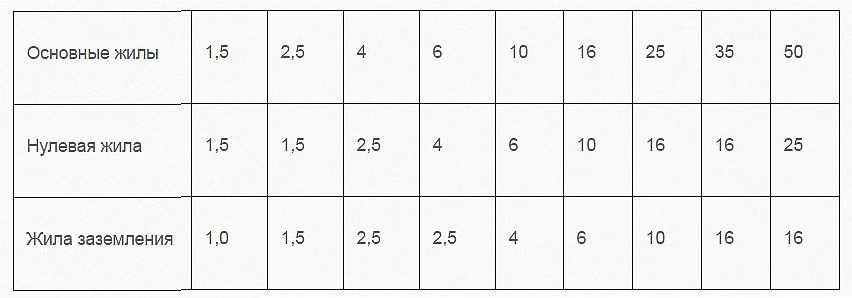 С повышением сечения основных жил, уменьшаются сечения жил нулевых и заземляющих. Вот несколько примеров по той же расстановке: