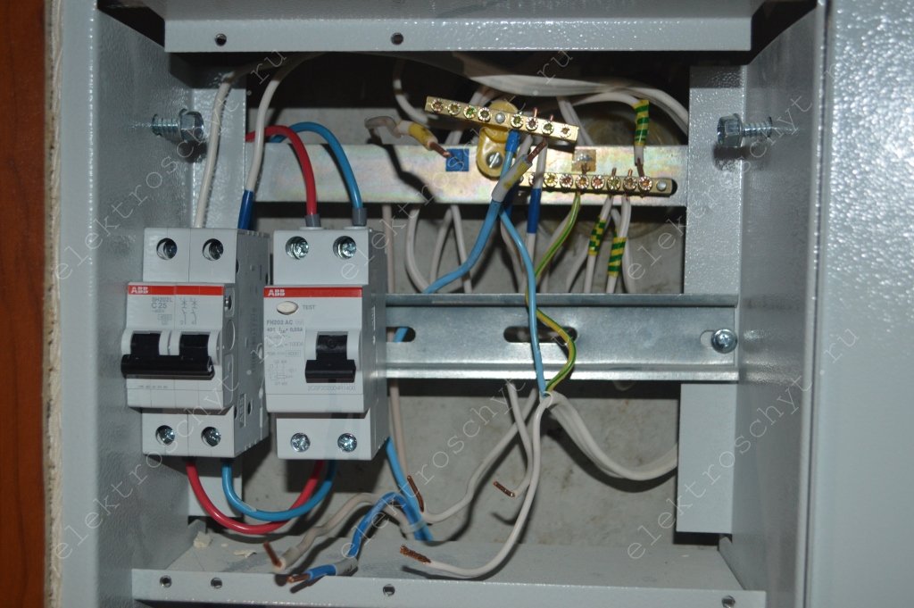 Далее в квартирный щиток устанавливаем и подключаем согласно схемы УЗО ABB на 40А с током утечки 30 мА. УЗО в квартирном щитке подключаем многопроволочным проводом ПВ-3, концы которого обжаты втулочными наконечниками НШВИ серого цвета для 4 кв.мм.