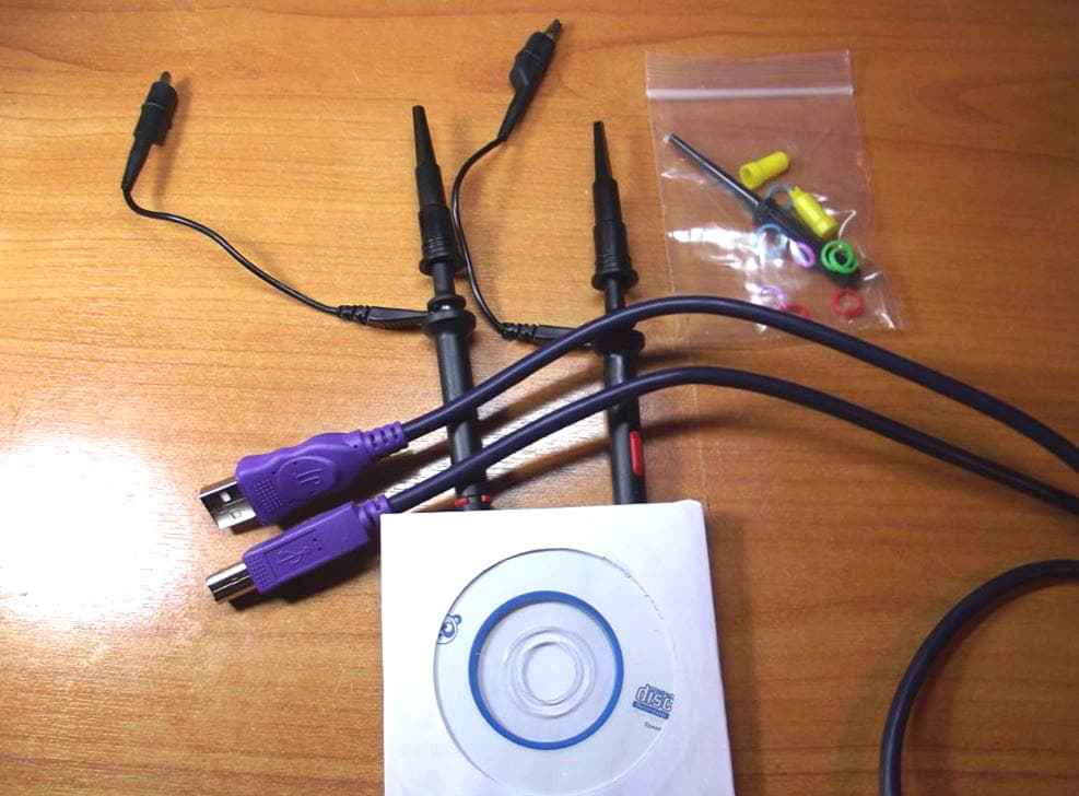 В придачу с ним шли 2 щупа, шнур USB, расходники, диск с ПО, а также отвертка для регулировки щупов
