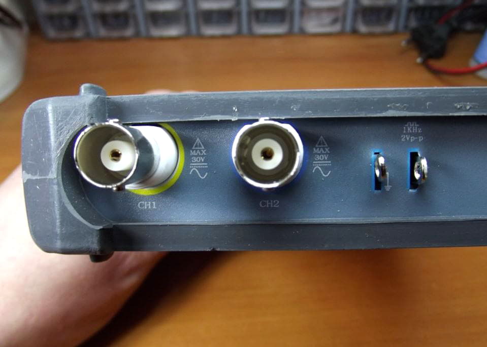 С одной стороны осциллографа мы видим два разъема для подключения щупов. Первый разъем CH1, что означает первый канал, а второй разъем CH2, то есть второй канал. Следовательно, осциллограф двухканальный. Справа видим два штыря. Эти штыри — генератор тестового сигнала для калибровки щупов осциллографа. Один из них земля, а другой — сигнальный. Калибруем точно также, как и простой цифровой осциллограф. Как это делать, я писал выше в статье.