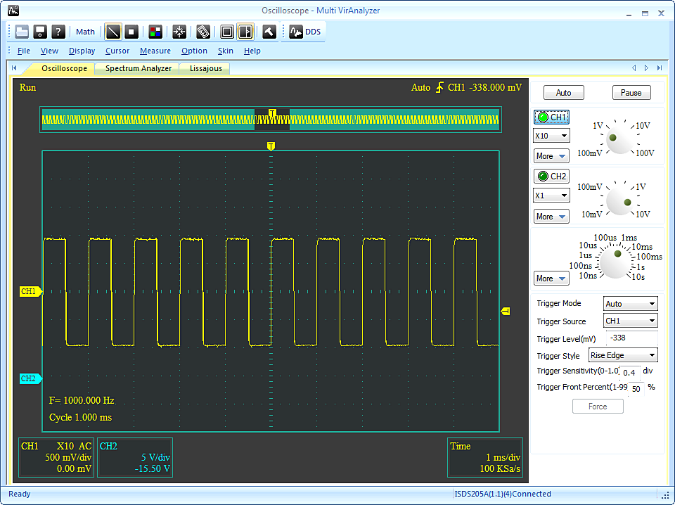 Для управления разверткой осциллографа предназначены кнопки ms/div. В программе можно сохранять осциллограмму и данные в файл при помощи соответствующих пунктов меню. Для виртуального включения и выключения осциллографа используются кнопки Power ON/OF. При отсоединении схемы осциллографа от компьютера, программа uScpoe автоматически переводится в режим OFF.