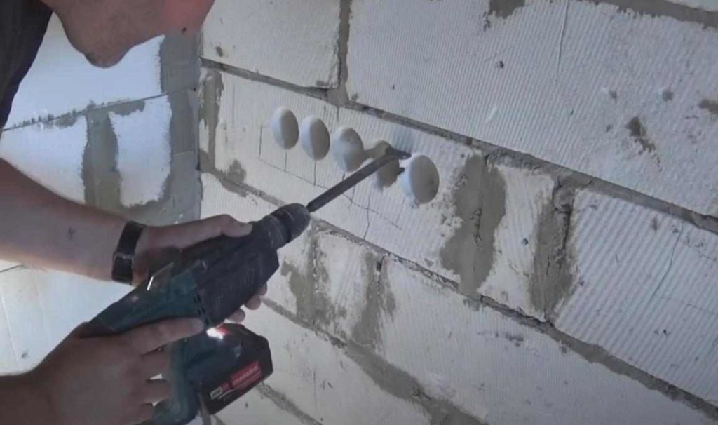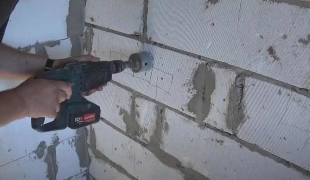 Кирпичные или бетонные стены имеют высокую прочность, поэтому для установки розеток в бетонную стену необходимо использовать перфоратор со специальными насадками. Они представляют собой цилиндрическую коронку с направляющим победитовым сверлом. С их помощью можно быстро справиться с бетонной стеной.