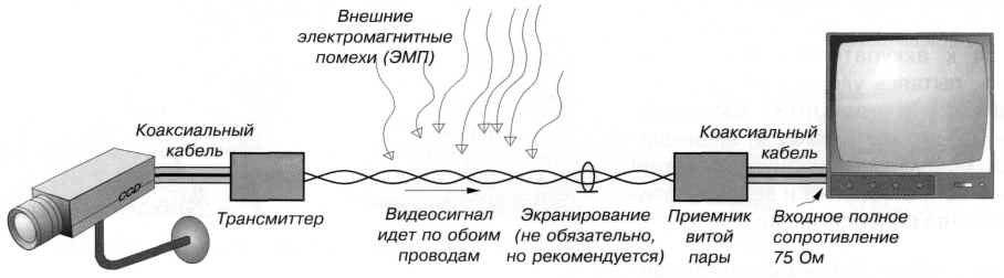 Передача видеосигнала по витой паре работает по иному принципу (симметричная видеопередача), чем в случае коаксиального кабеля. Жила “коаксиала” – единственный проводник сигнала, и единственный «приёмник» электромагнитных помех. С возрастанием длины этого кабеля растёт и количество артефактов изображения: перемещающиеся горизонтальные и вертикальные полосы, задержки. Конструкция кабеля сопротивляется ЭМП, но при больших расстояниях получается неэффективно. В витой паре оба провода принимают одинаковые помехи, которые успешно погашаются активным приёмником сигнала. В схеме подключения используются дополнительные устройства: трансмиттер сигнала по витой паре (расположен рядом с камерой) и упомянутый выше приёмник (его расположение – рядом с видеорегистратором).