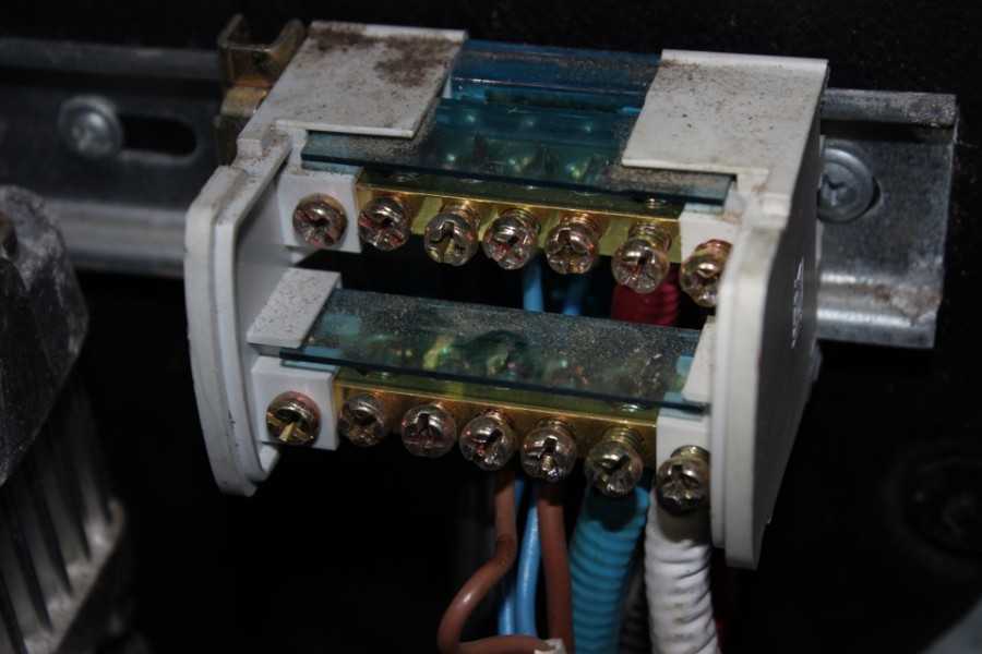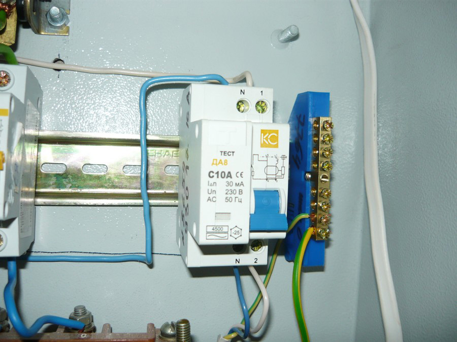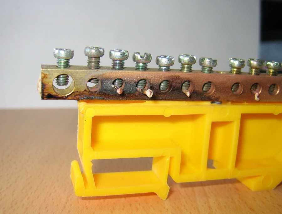 - Подключить проводник, идущий из устройства защитного отключения в один из зажимных болтов шины.