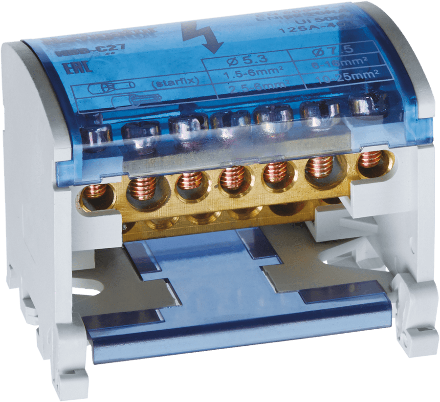 При детальном рассмотрении конструкции, можно заметить, что она представляет собой токопроводящую жилу и основание, изготовленное из пластика, которое предназначено для установки на DIN рейку.