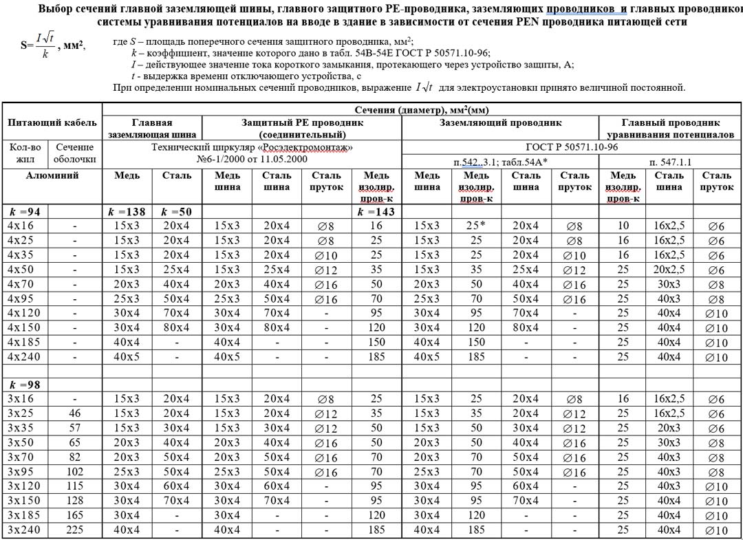 Получается, что если у вас кабель слишком толстый, то по вышеприведенной таблице вовсе не обязательно подбирать такую же большую медную шину ГЗШ. Главное, чтобы она была сечением в половину от фазной жилы.