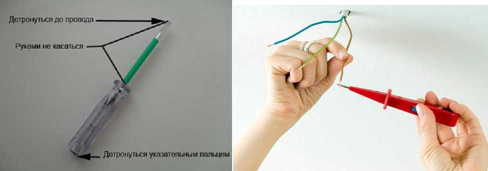 Берем мультиметр и/или индикаторную отвертку. С отверткой работать просто: при прикосновении к фазе загорается светодиод, вмонтированный в корпус. Так что определить фазные проводники будет легко. Если кабель двухжильный, проблем нет — второй проводник это ноль. Но если провод трехжильный, понадобиться мультиметр или тестер — с их помощью определим какой из оставшихся двух фазный, какой — нулевой.