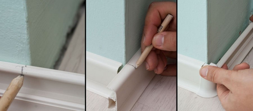 Их рассверливают осторожно, на жесткой поверхности, потому что плинтус, пластик которого имеет трещины, обязательно выбраковывается. Деталь подрезают под нужным углом и прикладывают к поверхности, отверстия переносят на стену