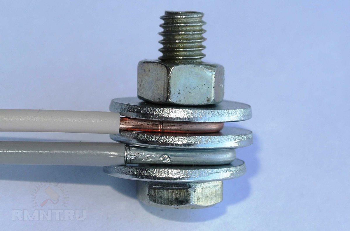 Если под болт необходимо зажимать жёсткий однопроволочный проводник (медь или алюминий) сечением до 10 мм2, то его можно с помощью круглогубцев изогнуть в виде кольца подходящего радиуса. Кольцо стеклянной шкуркой или наждачной бумагой зачищается от оксидной плёнки, смазывается кварцевазелиновым гелем и надевается на болт (кольцо должно обвивать болт по часовой стрелке), после чего оно накрывается шайбой-звёздочкой (предотвращает выдавливание проводника), гровером (пружинит соединение, не даёт раскрутиться при вибрациях), и сборный зажим плотно затягивается гайкой. Если под болт следует зажать жилу большого сечения (от 10 мм2), то методом опрессовки на проводник насаживается металлическая гильза с кольцом.
