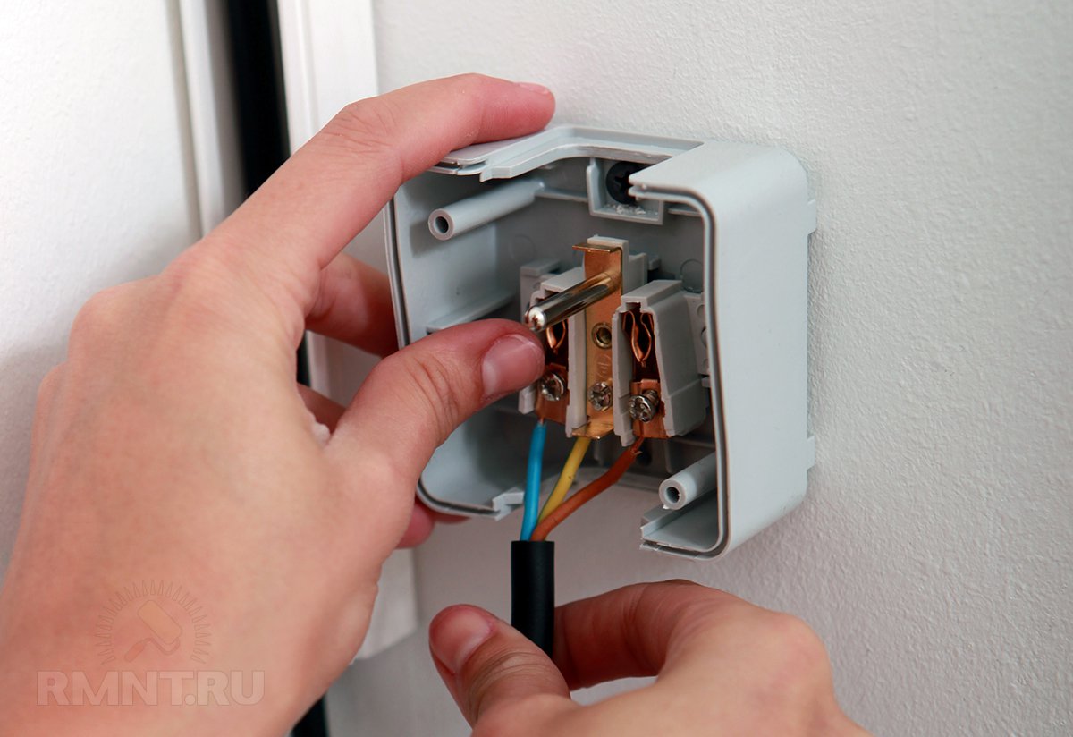 - Открываем розетку; в случае, если работа по ее подключению выполнена медным проводом с цветовым отличием, то: