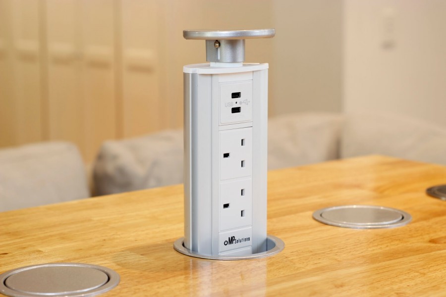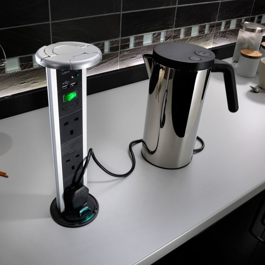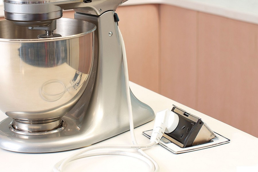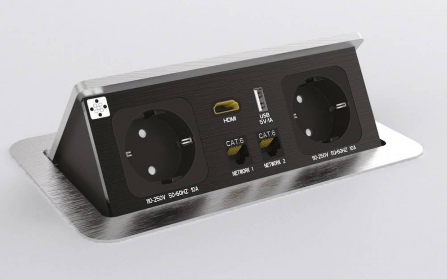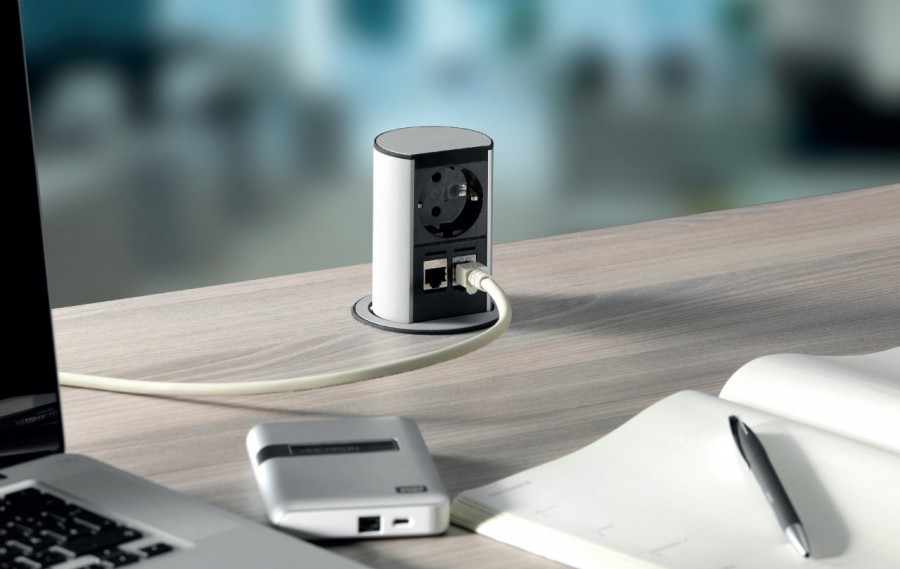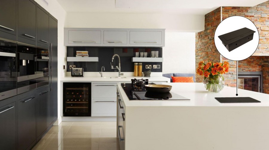 - дизайн остается непогрешимым. Встраиваемый блок можно включить в розетку, расположенную внизу, например, под столом либо подвести к нему кабель под плинтусом, так что вообще никаких электроточек не будет видно;