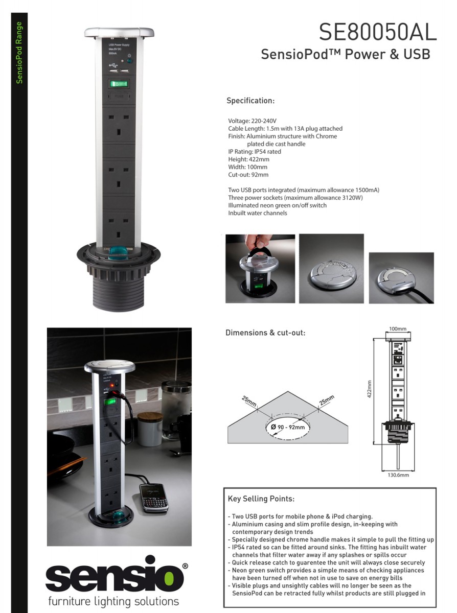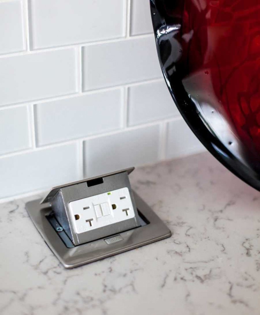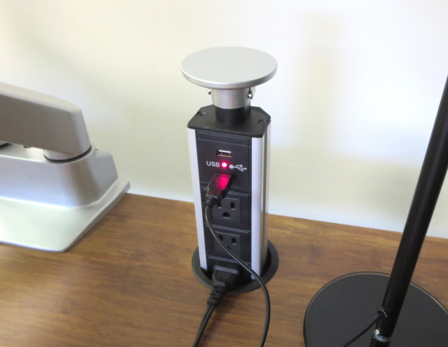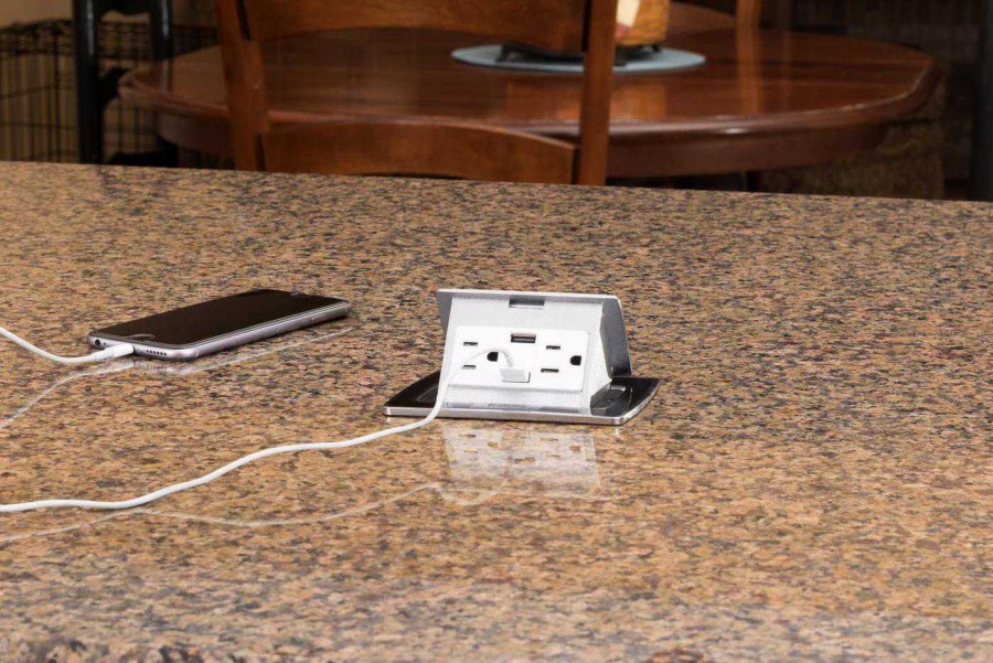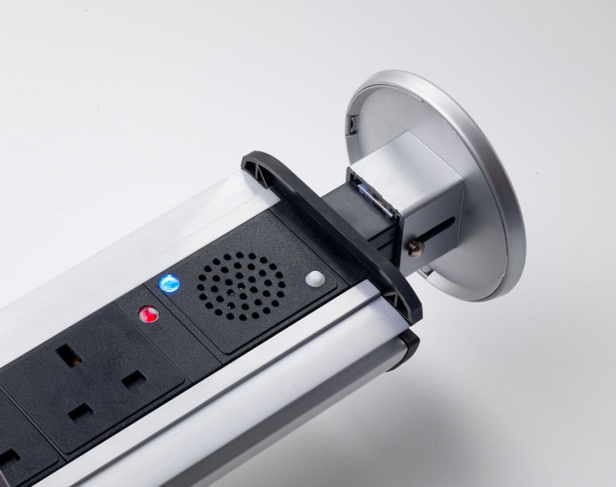 - дизайн остается непогрешимым. Встраиваемый блок можно включить в розетку, расположенную внизу, например, под столом либо подвести к нему кабель под плинтусом, так что вообще никаких электроточек не будет видно;
