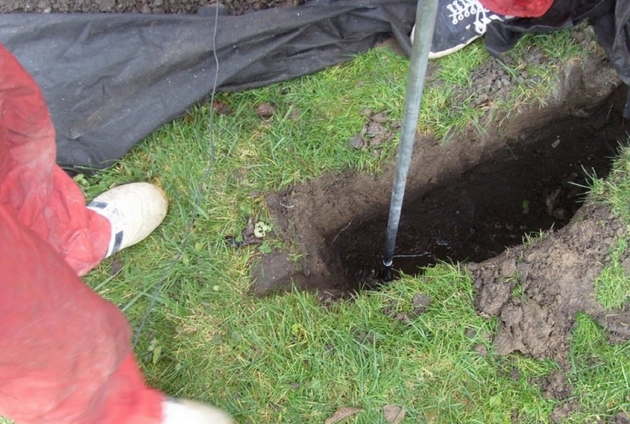 Одновременно с подготовкой точечных штыревых заземлителей начинается этап земляных работ, состоящих в подготовке канавок со скошенными краями (для лучшего удерживания грунта от осыпания).